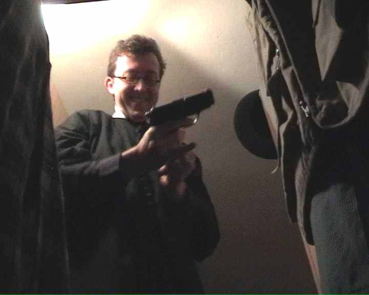 Probleme hatten wir mit der Beleuchtung, da sich der Schauspieler einige Male in den Schrank beugen musste, und dadurch die Ausleuchtung des Gesichtes nicht mehr ganz zufriedenstellend war. Dieses Problem wäre jedoch nur durch die Positionierung eines (oder mehrerer) Scheinwerfers im Schrank zu umgehen gewesen. Da wir am Anfang und am Ende der Szene aber totale Dunkelheit haben wollten (bis die Schranktüren durch Franziskus geöffnet bzw. geschlossen werden), kam dies nicht in Frage. Auch die bei der Planung favourisierte Radium-Lampe (siehe Eintrag vom 13.12.2000) haben wir weggelassen, da der Kellerraum zum einen sonst zu hell erschienen wäre und sich zum anderen zu viele verschiedene Lichtsorten (Neonröhre, Glühbirnen und Radiumlampe) gemischt hätten.
